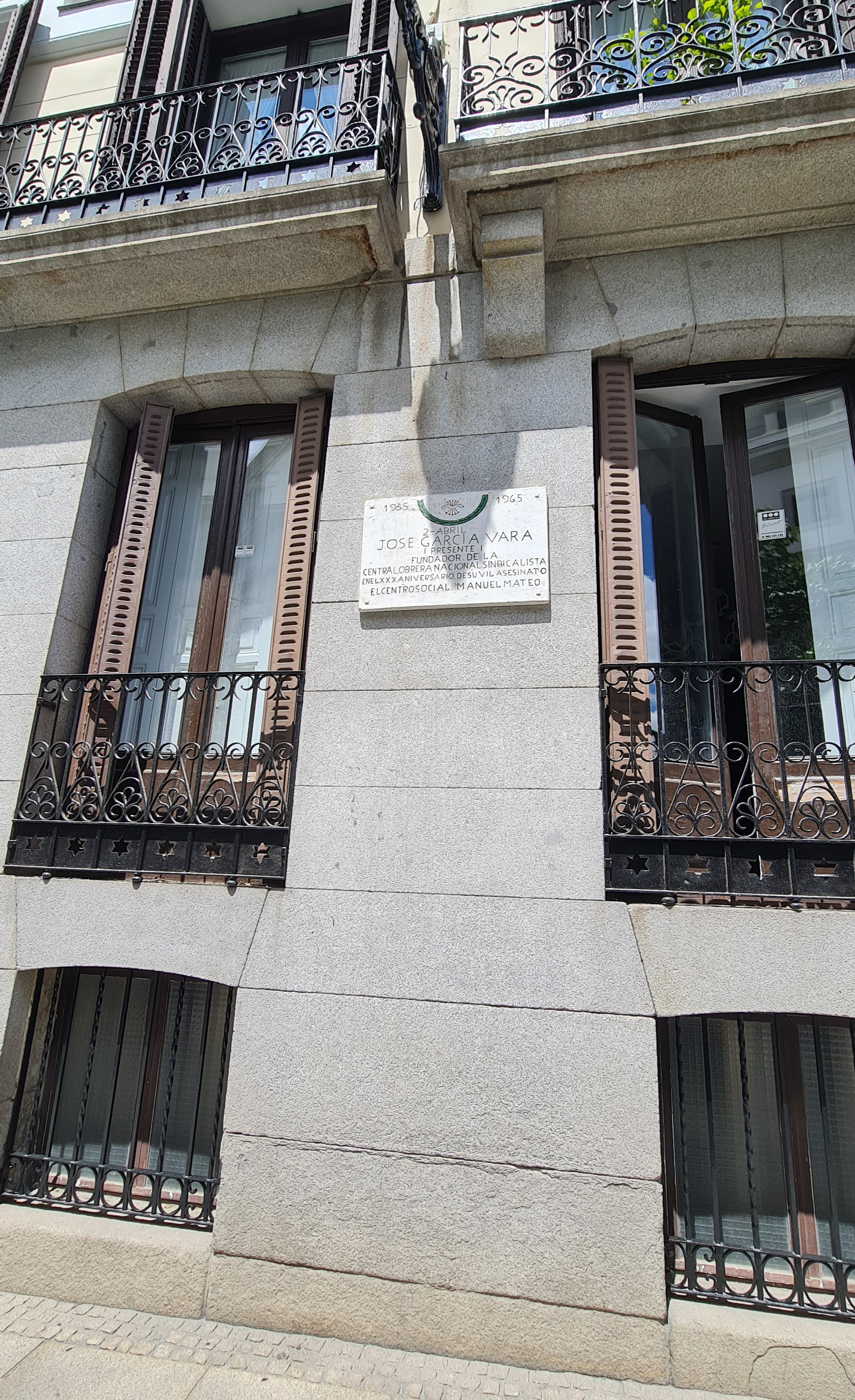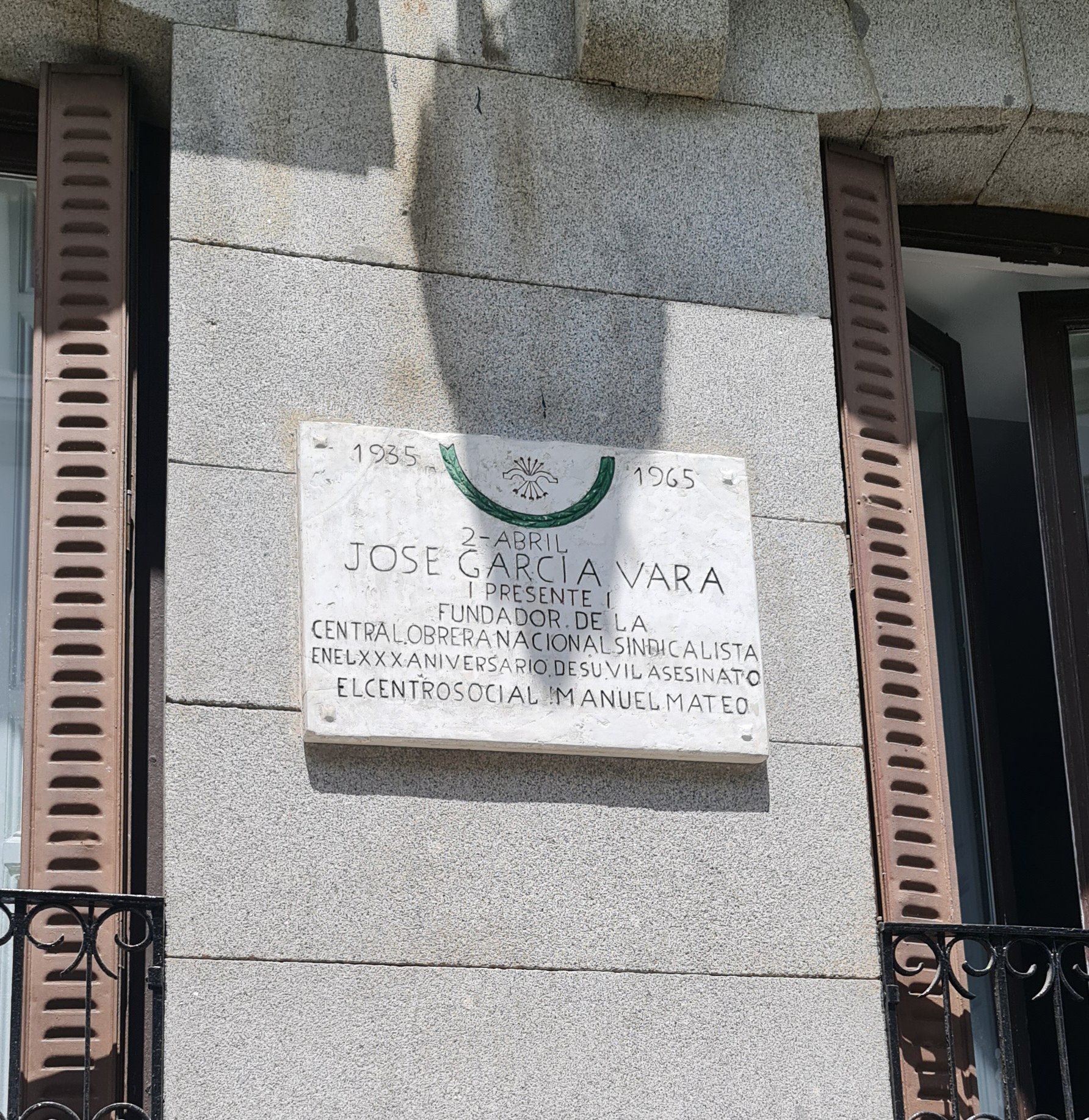 Hay una placa en la calle Arrieta de Madrid, junto a la plaza de la Ópera, dedicada a un sindicalista llamado José García Vara. Fue colocada el 2 de abril de 1965 por el Centro Social Manuel Mateo, 30 años después de su asesinato en ese mismo lugar. Esa estela, hecha artesanalmente y grafiada a cincel, me ha dado pie a conocer el nombre de varios sindicalistas de diferente procedencia ideológica que forman parte de la historia de España. Sus biografías se entremezclan: el propio García Vara, Manuel Mateo, Rafal Henche, Evaristo Gil, Sergio García, Enrique Puente Abuin, Nicasio Álvarez de Sotomayor, Ángel Pestaña, Guillén Salaya, Manuel Montero, Camilo Olcina, José Hernando, Marcelino Camacho, Julián Ariza, Enrique Castro Delgado, Víctor Martínez Conde, Ceferino Maestú Barrio, Serafín y Emilio Reboul Estecha, Jesús Matorras Navarro, Nicasio Álvarez de Sotomayor, José Jiménez de Parga, Manuela Carmena, Cristina Almeida y José María de Llanos.