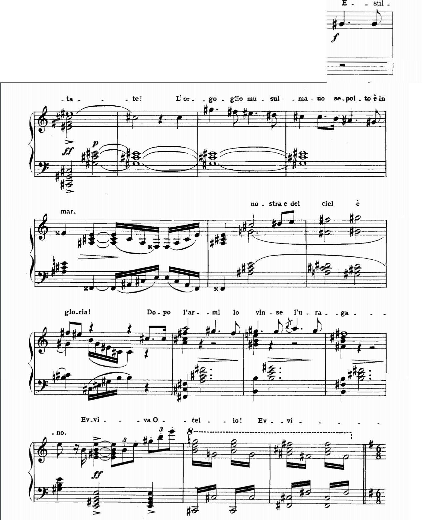 El comienzo de Otelo es espectacular como corresponde al anuncio de una vitoria. Estamos en un puerto naval en Chipre, en medio de una terrible tempestad, y los venecianos, dueños de la isla, esperan la llegad de su líder. Nadie sabe aún que los turcos han sido vencidos, y solo cuando al final llega Otello, sabe de la victoria al escucharle ese triunfal Esultate.