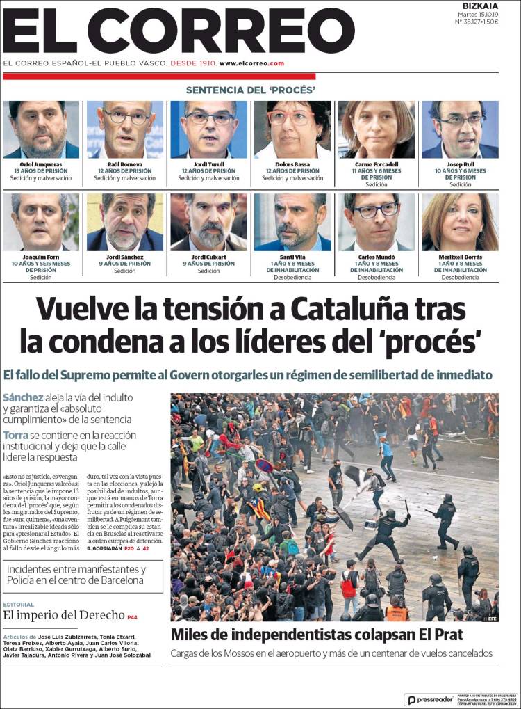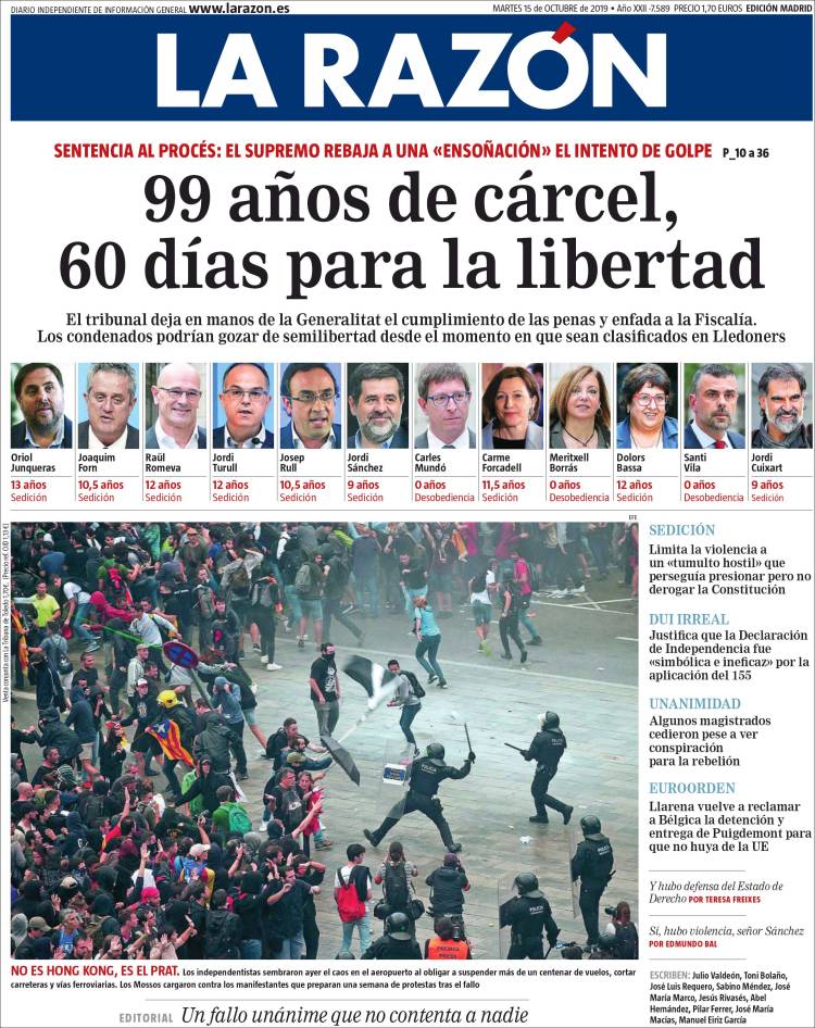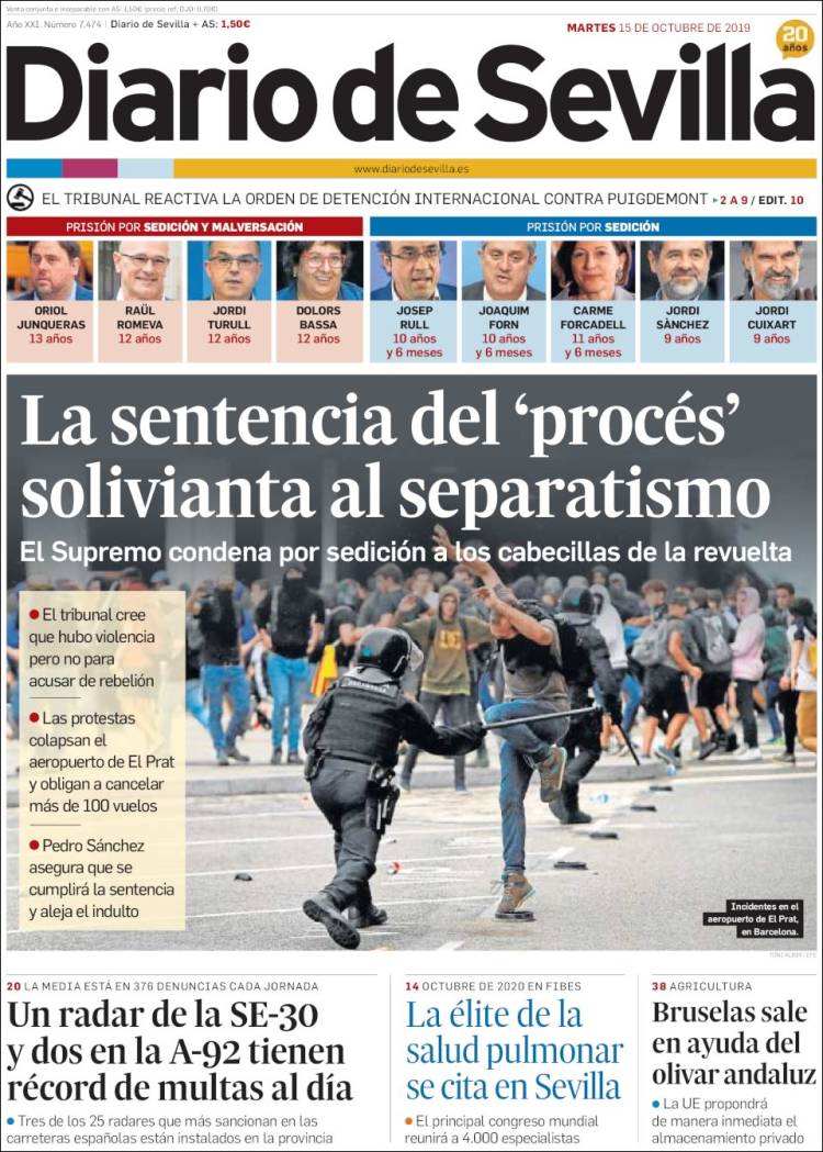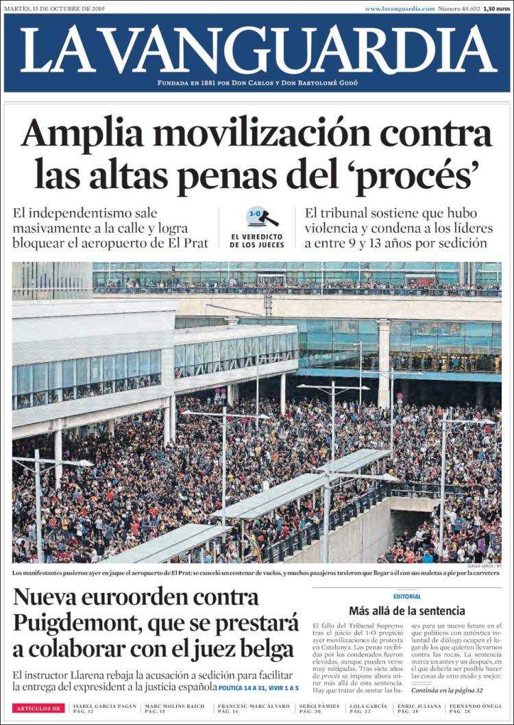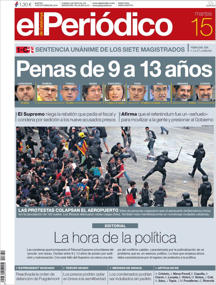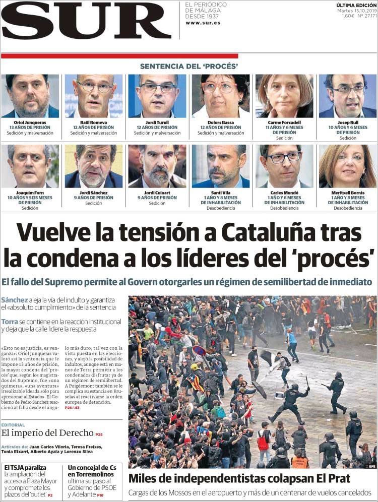 La publicación de la sentencia del Procés incendió los ánimos de muchos catalanes alentados por las declaraciones incitadoras de sus líderes políticos. Ese mismo día, las masas, siguiendo la llamada de un movimiento hasta ahora desconocido, Tsunami Democrátic, cortaron el acceso al aeropuerto de El Prat además de otras vías de comunicación, entre ellas la AP7 y el AVE de alta velocidad a Girona.