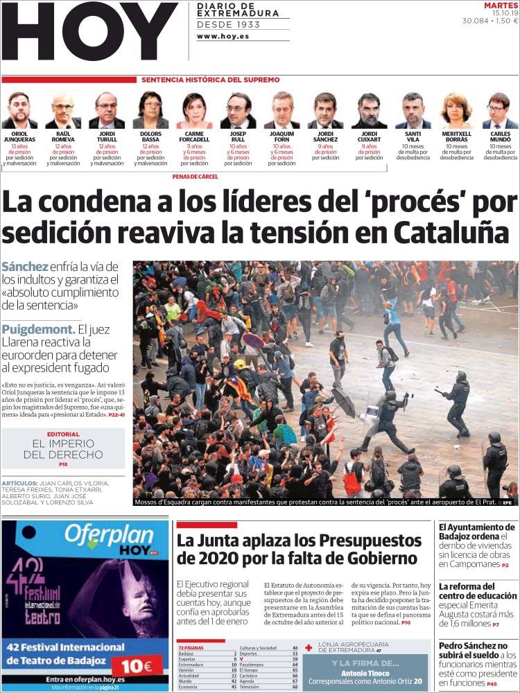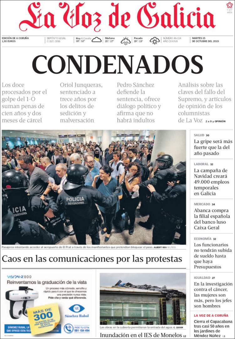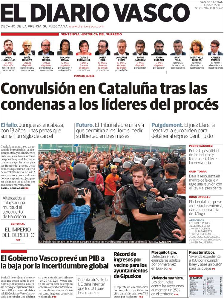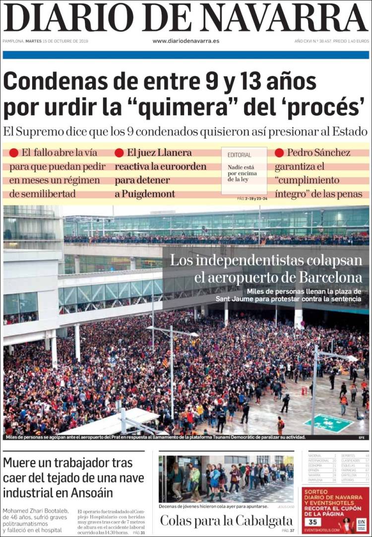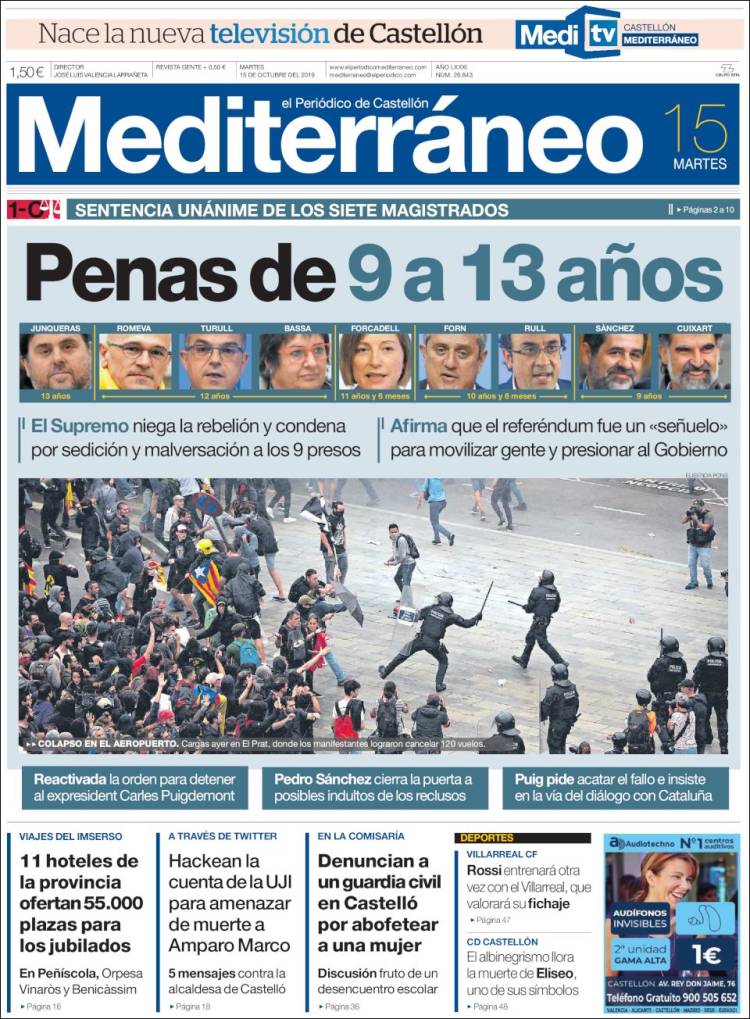 La publicación de la sentencia del Procés incendió los ánimos de muchos catalanes alentados por las declaraciones incitadoras de sus líderes políticos. Ese mismo día, las masas, siguiendo la llamada de un movimiento hasta ahora desconocido, Tsunami Democrátic, cortaron el acceso al aeropuerto de El Prat además de otras vías de comunicación, entre ellas la AP7 y el AVE de alta velocidad a Girona.