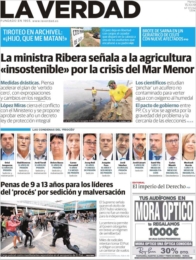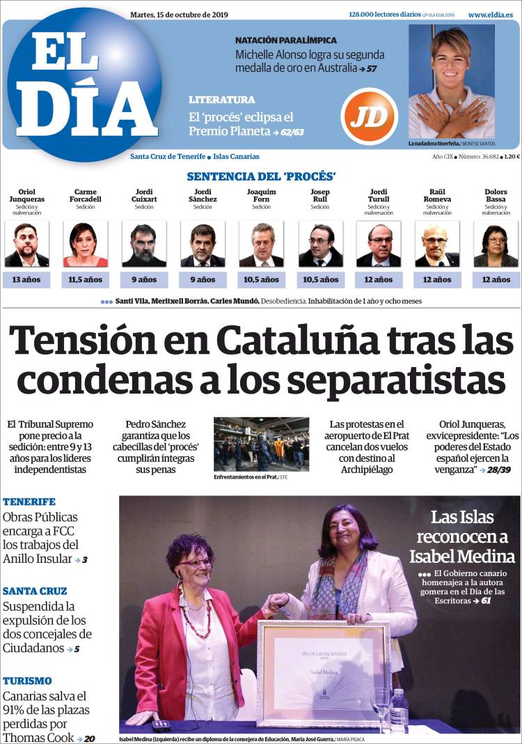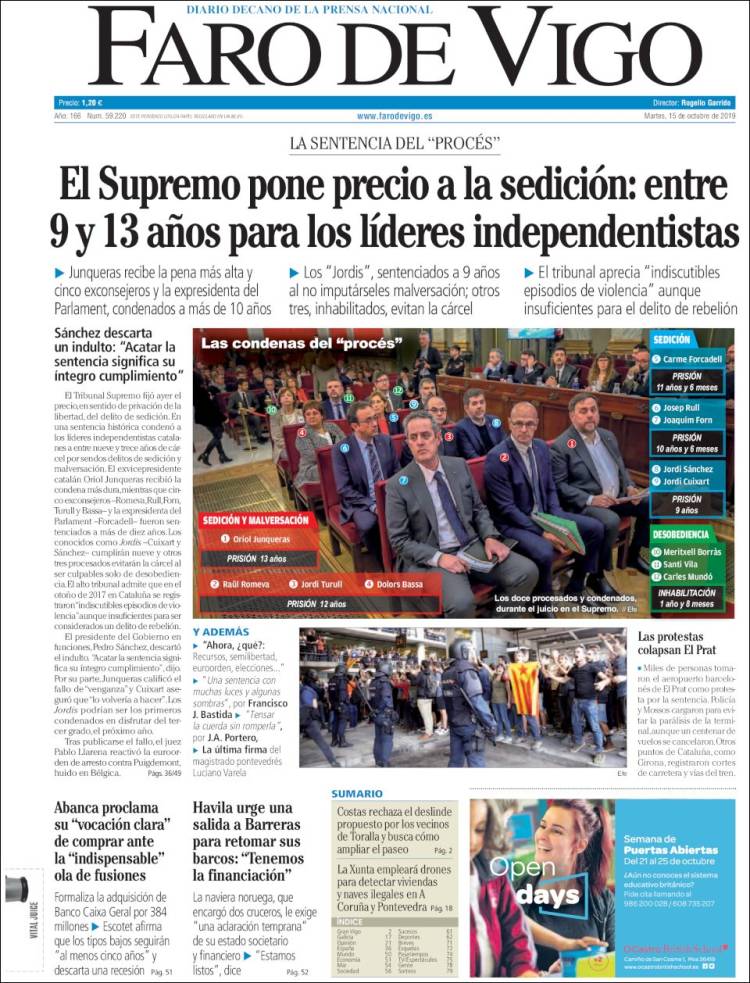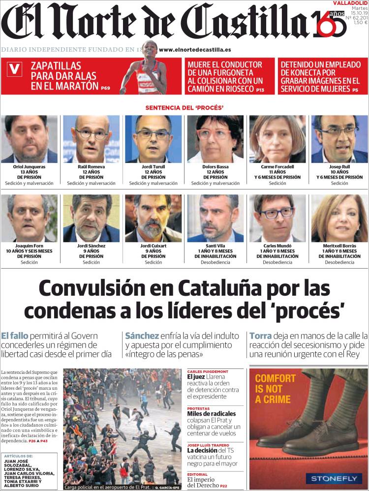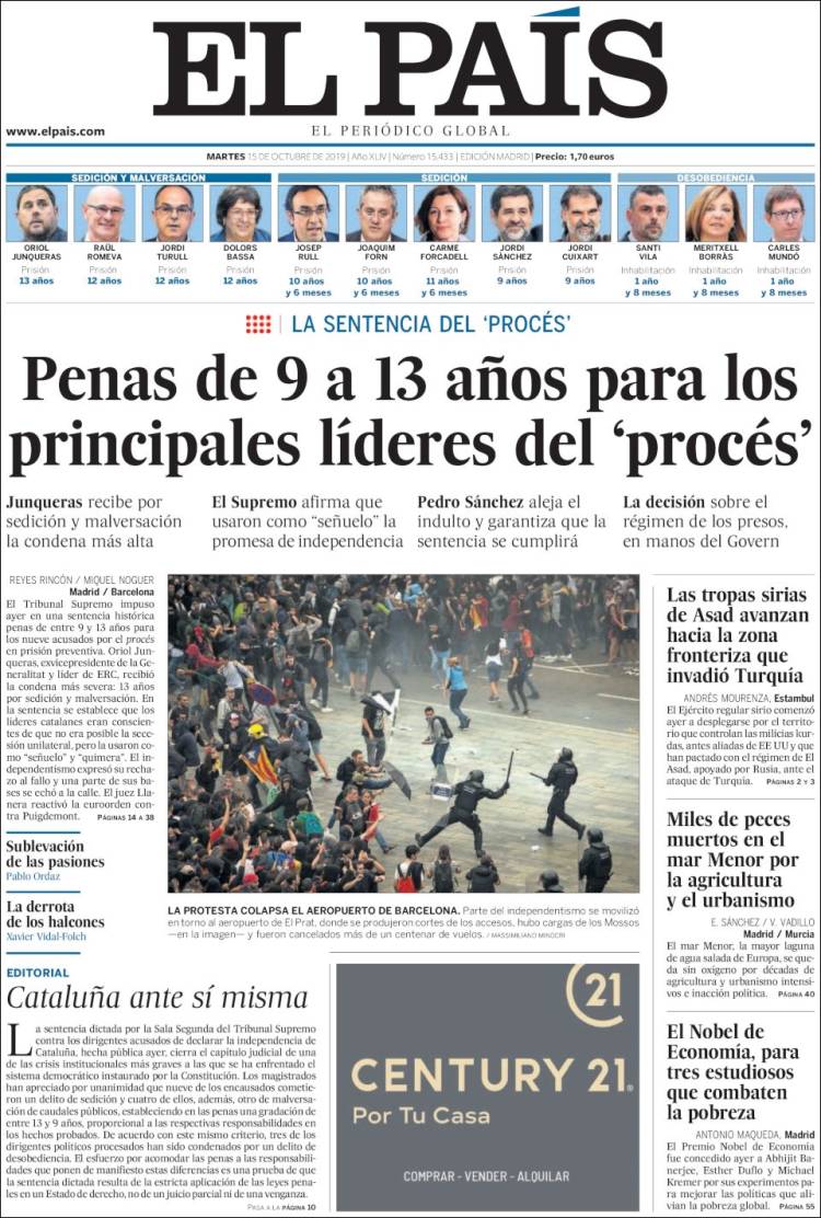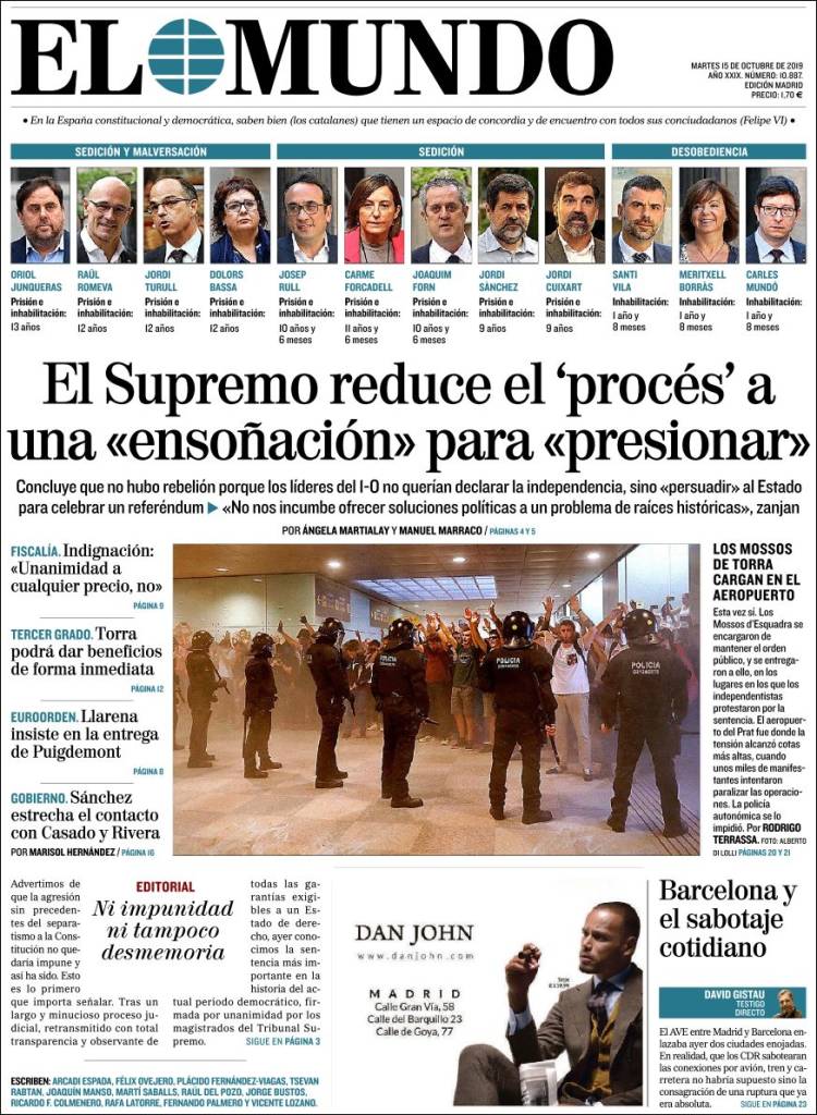 El 14 de octubre de 2019, el Tribunal Supremo dictó sentencia en el caso del procés. Las penas oscilan entre 9 y 13 años de cárcel a los nueve líderes independentistas catalanes condenados por sedición en el juicio del procés. El exvicepresidente de la Generalitat Oriol Junqueras afronta la pena más alta, 13 años, por un delito de sedición en concurso medial (cuando un delito es un medio necesario para la comisión de otro) con malversación.