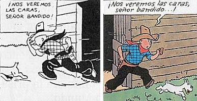 Hergé va perfeccionando su línea clara y aprendiendo las técnicas del dibujo y del cómic. En esta ilustración de abajo, Tintín corre de derecha a izquierda en la edición en blanco y negro, mientras que en la de color, Hergé corrige el error técnico. Es práctica común y considerado así, que el personaje cuando corre de izquierda a derecha avanza, mientras que si lo hace de derecha a izquierda vuelve sobre sus pasos.