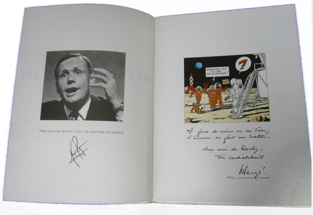 Hergé se documentó acerca de la posibilidad de que el hombre viajara a la Luna y cuando la gesta se cumplió, el creador de Tintín envió a Neil Armstrong un dibujo firmado en el que decía en frances: «A fuerza de creer en sus sueños, el hombre los hace realidad».