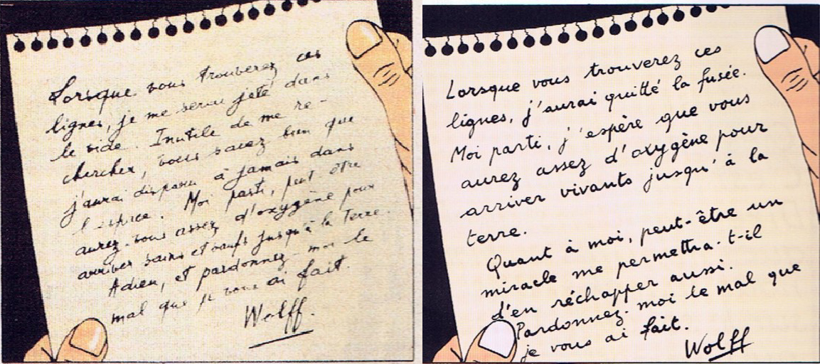 En una primera edición de 1953, Wolf escribe una nota de despedida en la que manifiesta que cuando la lean habrá desaparecido. Esta intención de suicidarse en beneficio del resto de la tripulación ante la falta de oxígeno en la nave, provocó alguna crítica por lo que Hergé decidió cambiar el texto de la nota manuscrita eliminando el hecho de que habrá desaparecido, y sustituyendo esta frase por una ilusa salvación del ingeniero debida a un imposible milagro.